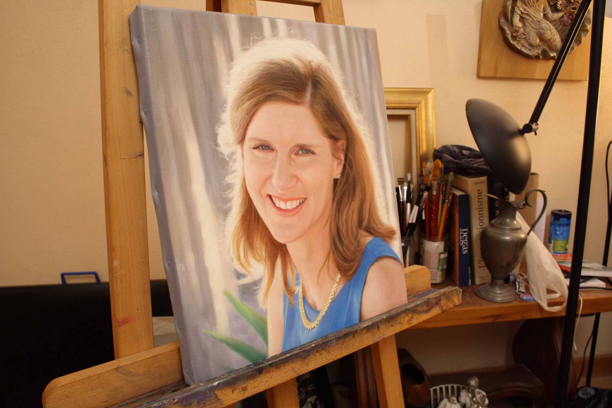 Ensuite, je peins pour restituer la lumière, la ressemblance et l’âme du modèle ; vous recevez enfin une image du tableau terminé pour validation, avant son envoi protégé.